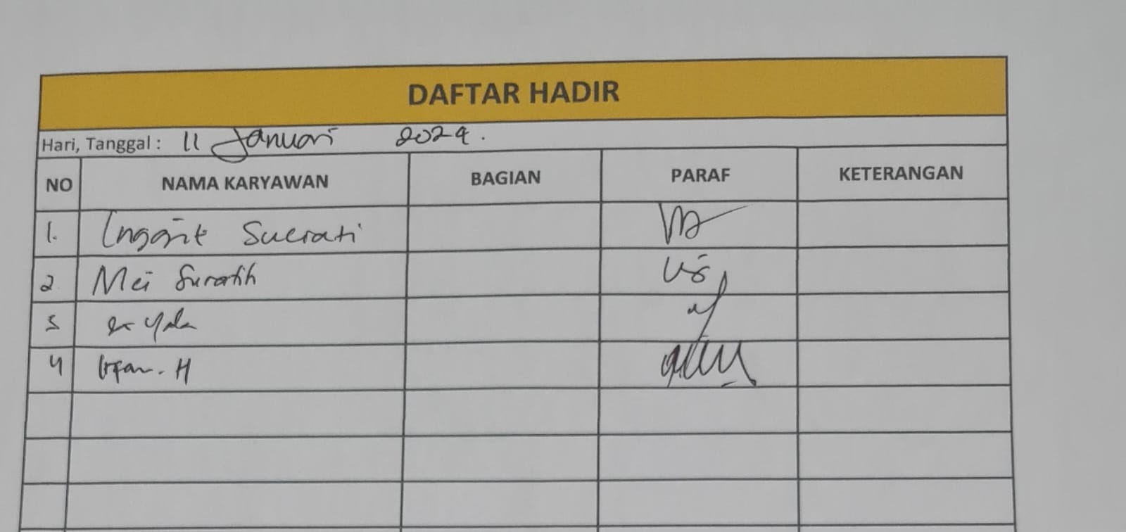 - Standar penampilan (Mulai Baju seragam, Makeup, Sepatu) Monitoring di pagi, siang jam 14.00.