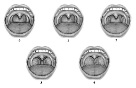 T2: 25-50% volume tonsil dibandingkan dengan volum orofaring atau batas medial tonsil melewati 1⁄4 jarak pilar anterior-uvula sampai 1⁄2 jarak pilar anterior-uvula.